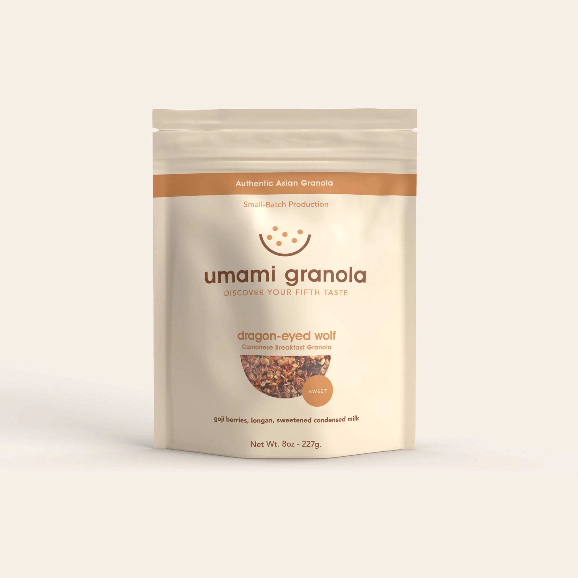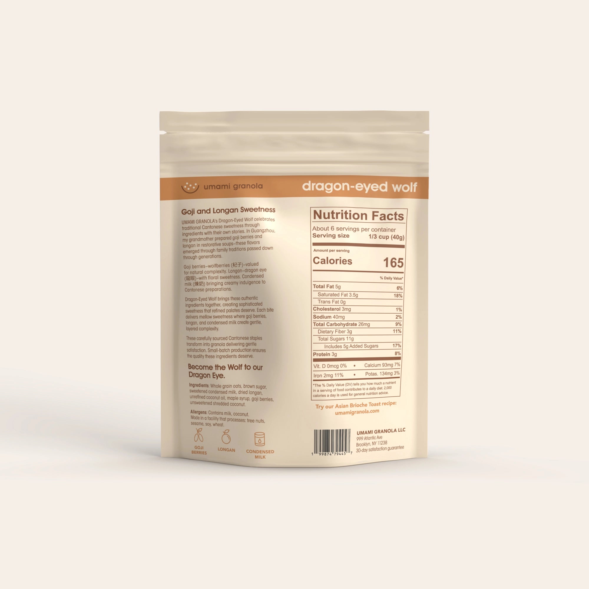 Experience floral sweetness that carries forward Cantonese sweet soup traditions through small-batch production. Tart-sweet goji berries (杞子) meet traditional longan (龍眼) and sweetened condensed milk (煉奶) in this granola inspired by tong sui (糖水), traditional Cantonese sweet soup.